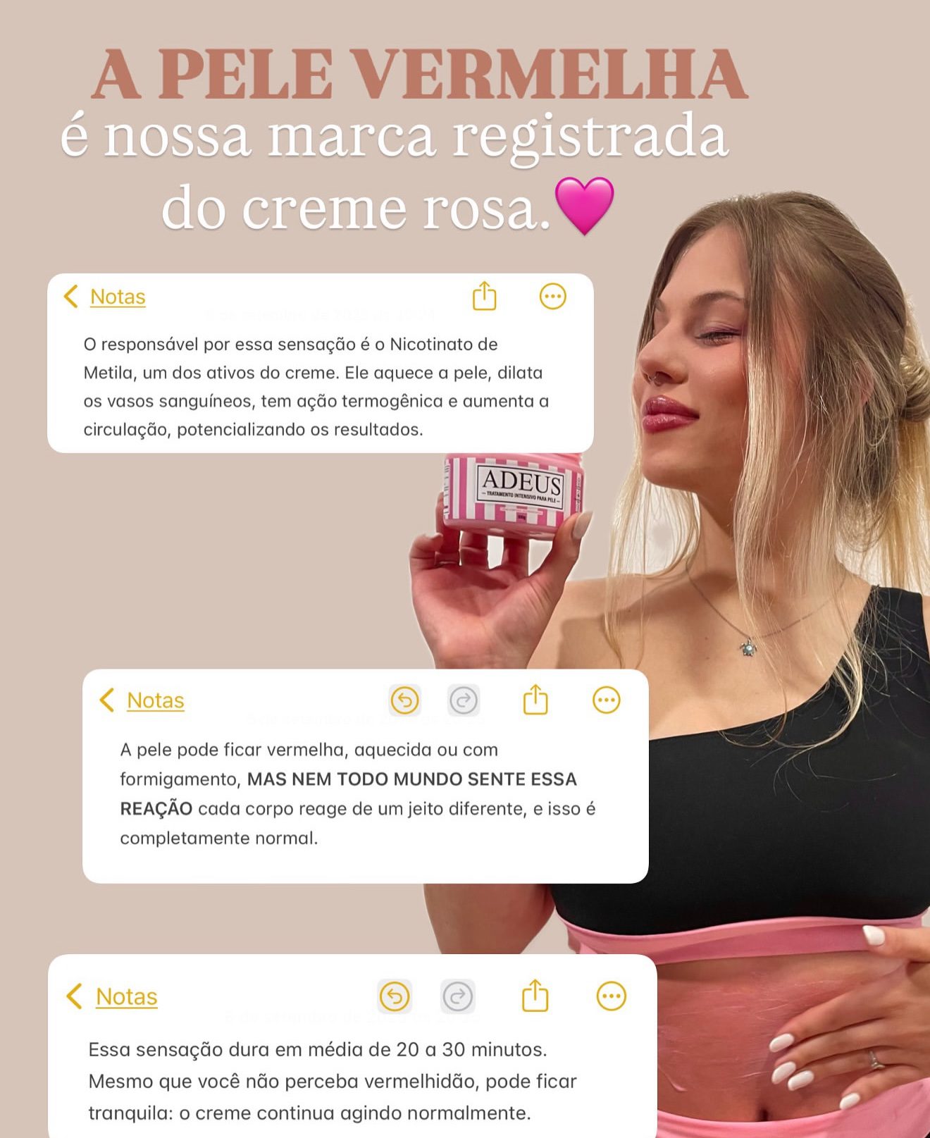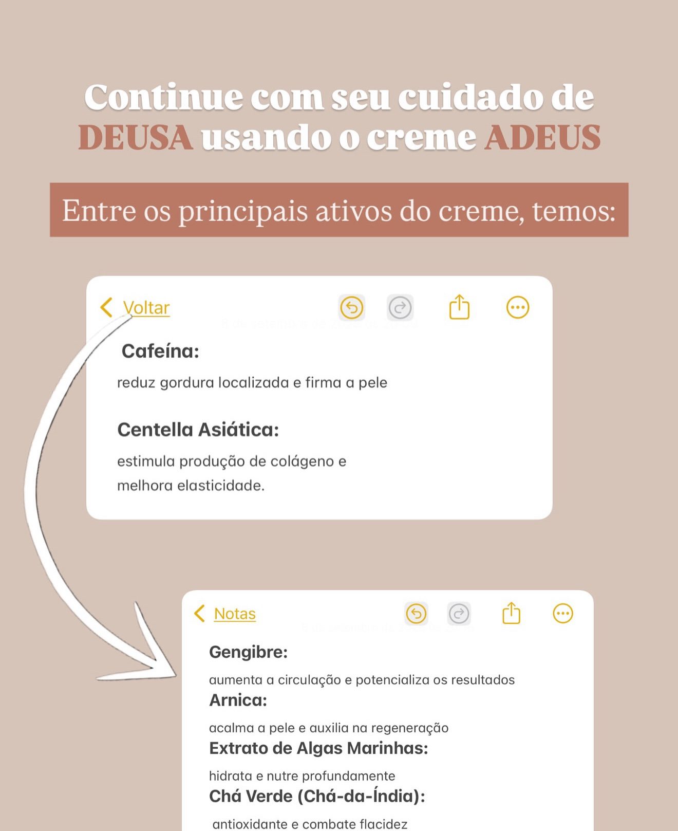 O ADEUS é um creme de tratamento intensivo para a pele com tecnologia termogênica, desenvolvido para reduzir celulites, suavizar estrias e ajudar na diminuição de medidas. Sua textura cremosa é ideal para massagem corporal e uso diário.