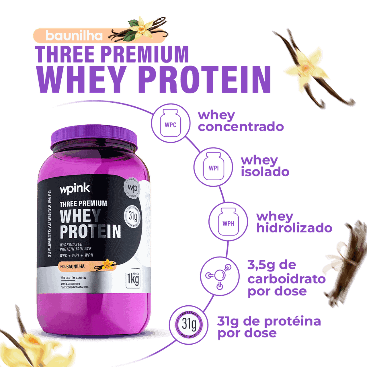 O Three Premium Whey Protein WP é o suplemento ideal para quem deseja maximizar o crescimento muscular e a recuperação após os exercícios. O nosso Three Premium Whey Protein é formulado com os três melhores tipos de whey: Whey Protein Concentrado, Whey Protein Isolado e Whey Protein Hidrolisado, o que o torna ainda mais completo e eficaz.